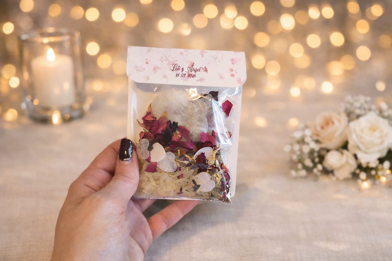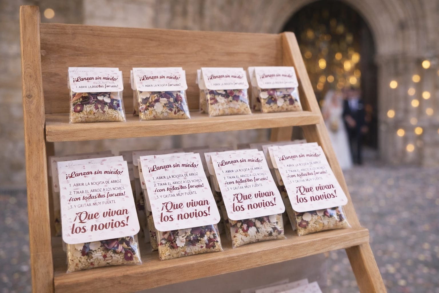 Además, para que tengas todo preparado sin preocuparte por nada, puedes elegir añadir también el arroz junto a las bolsitas arroz para bodas, creando así un conjunto práctico y listo para usar el día de tu celebración. Un detalle sencillo que hará que uno de los momentos más especiales de tu boda sea aún más inolvidable para todos.