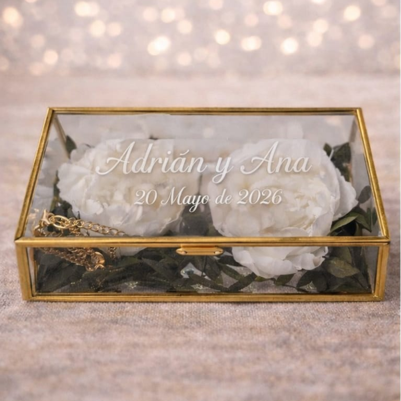Además, la cajita de cristal del porta alianzas bodas se personaliza con los nombres de los novios y la fecha del enlace, grabados directamente en el cristal. De esta manera, no solo es un accesorio para la ceremonia, sino también un recuerdo único que se podrá conservar para siempre como símbolo de ese día tan especial.