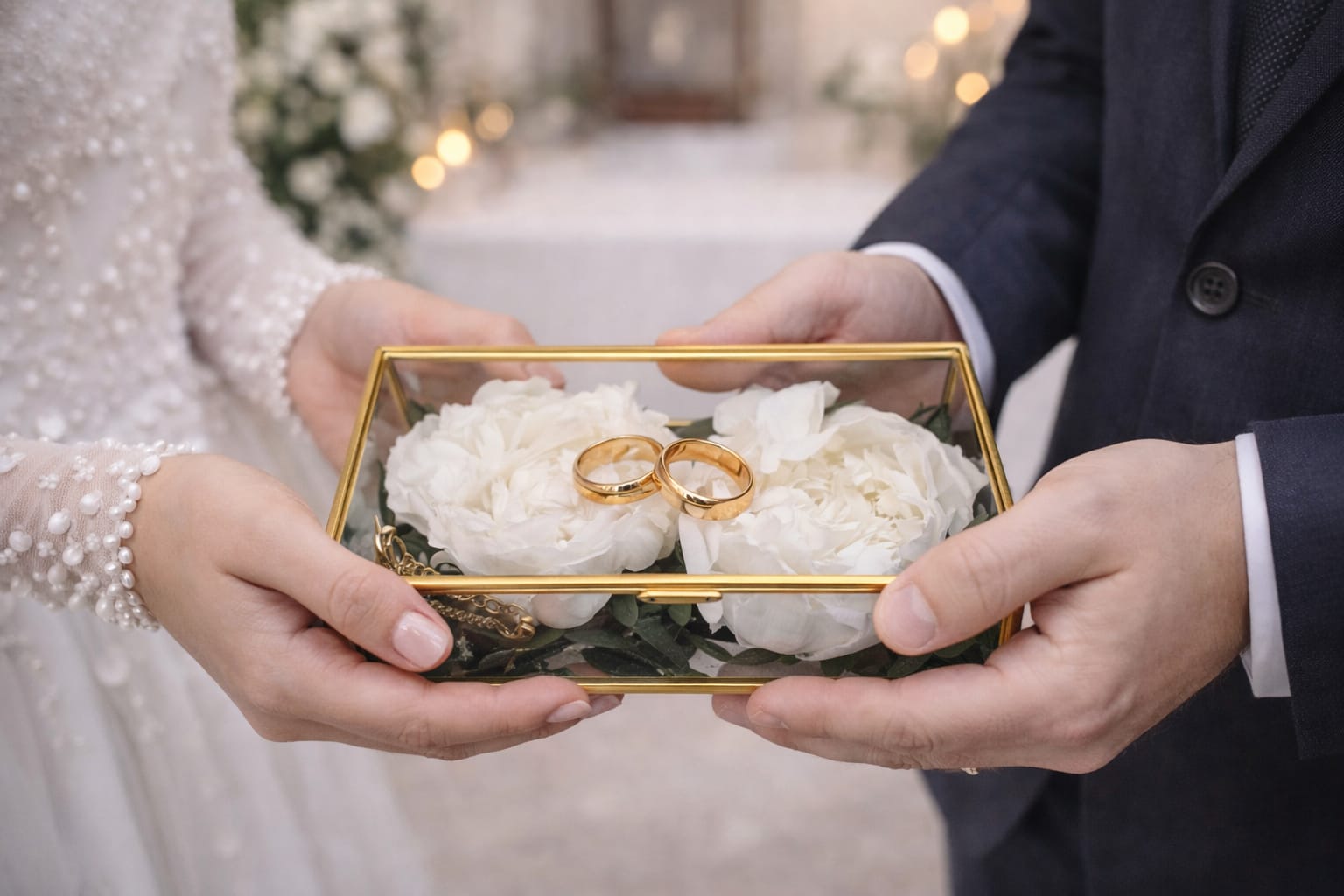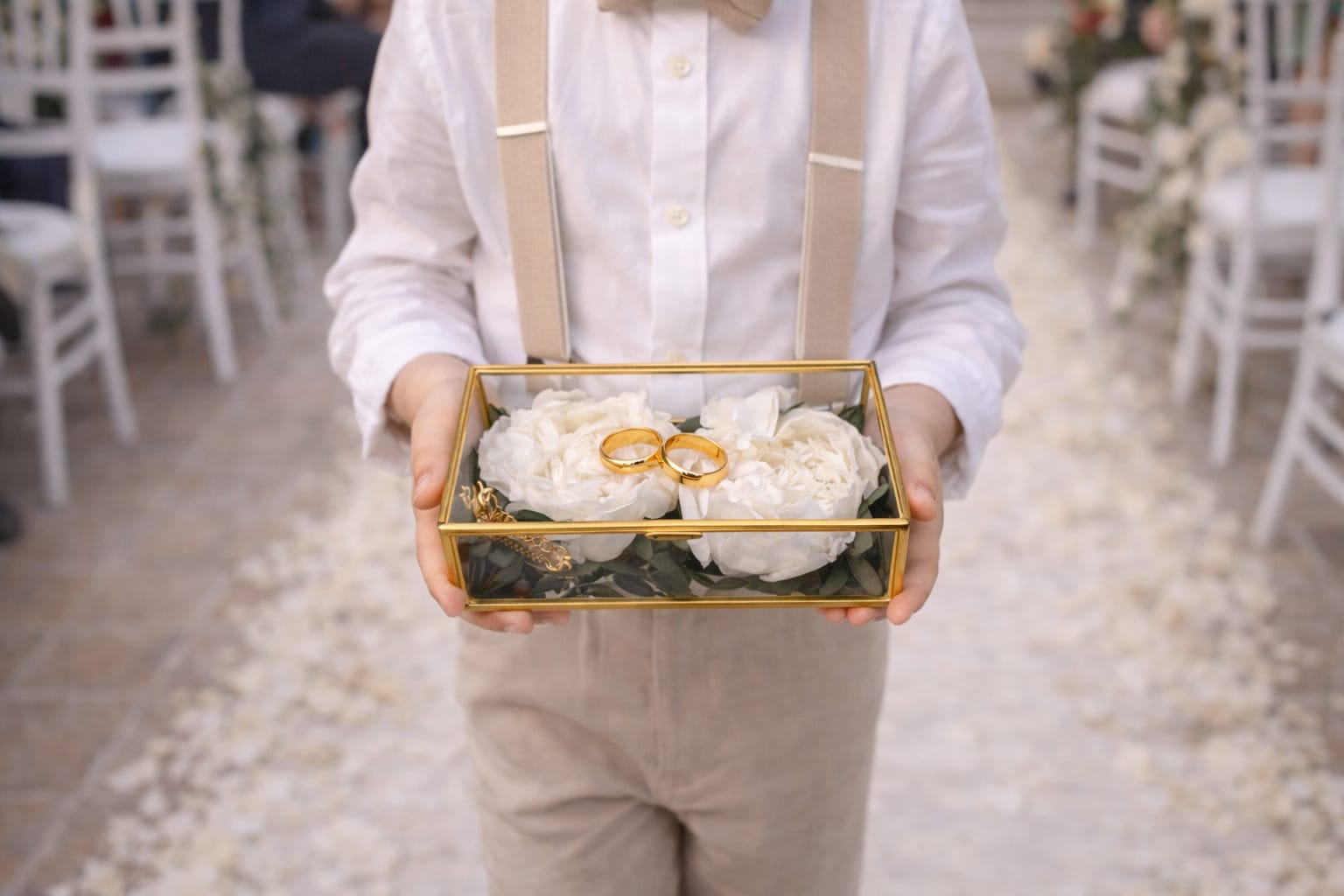 En su interior, el porta alianzas bodas incluye dos flores, que pueden ser peonias, rosas o paniculata, aportando un toque romántico y natural que hace que el conjunto resulte aún más bonito. Las flores acompañana a las alianzas creando una presentación cuidada y perfecta para ese instante tan importante.