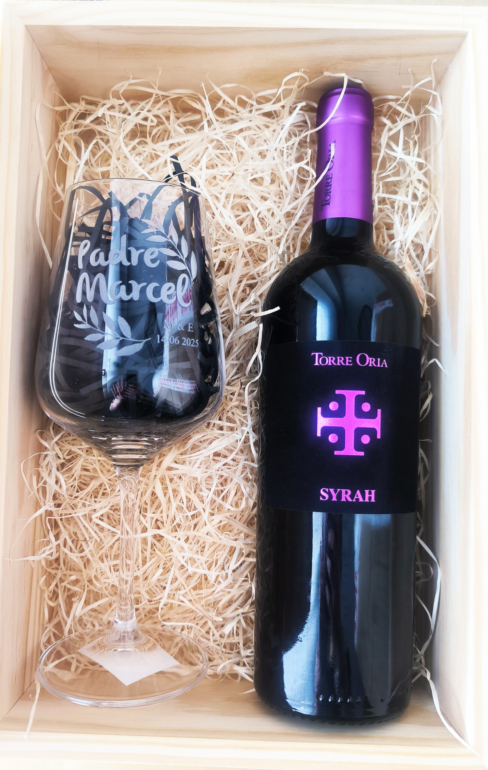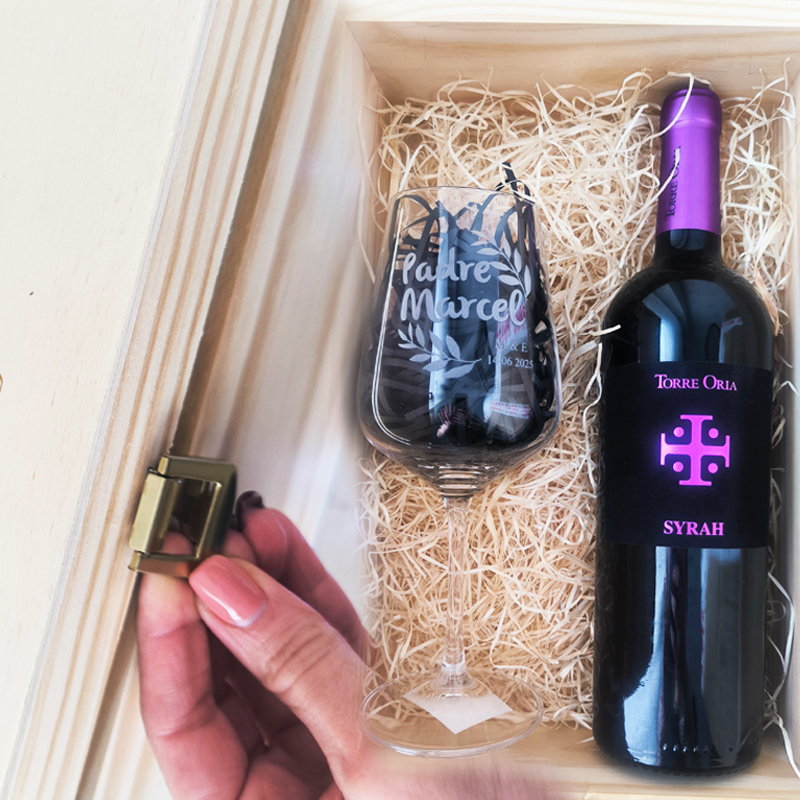 En su interior tenemos una botella de un vino seleccionado, en el que podemos personalizar su etiqueta original con su nombre y un mensaje emotivo, también incluye una copa grabada con su nombre. Este pack es perfecto para disfrutar del vino y para brindar por una vida juntos.