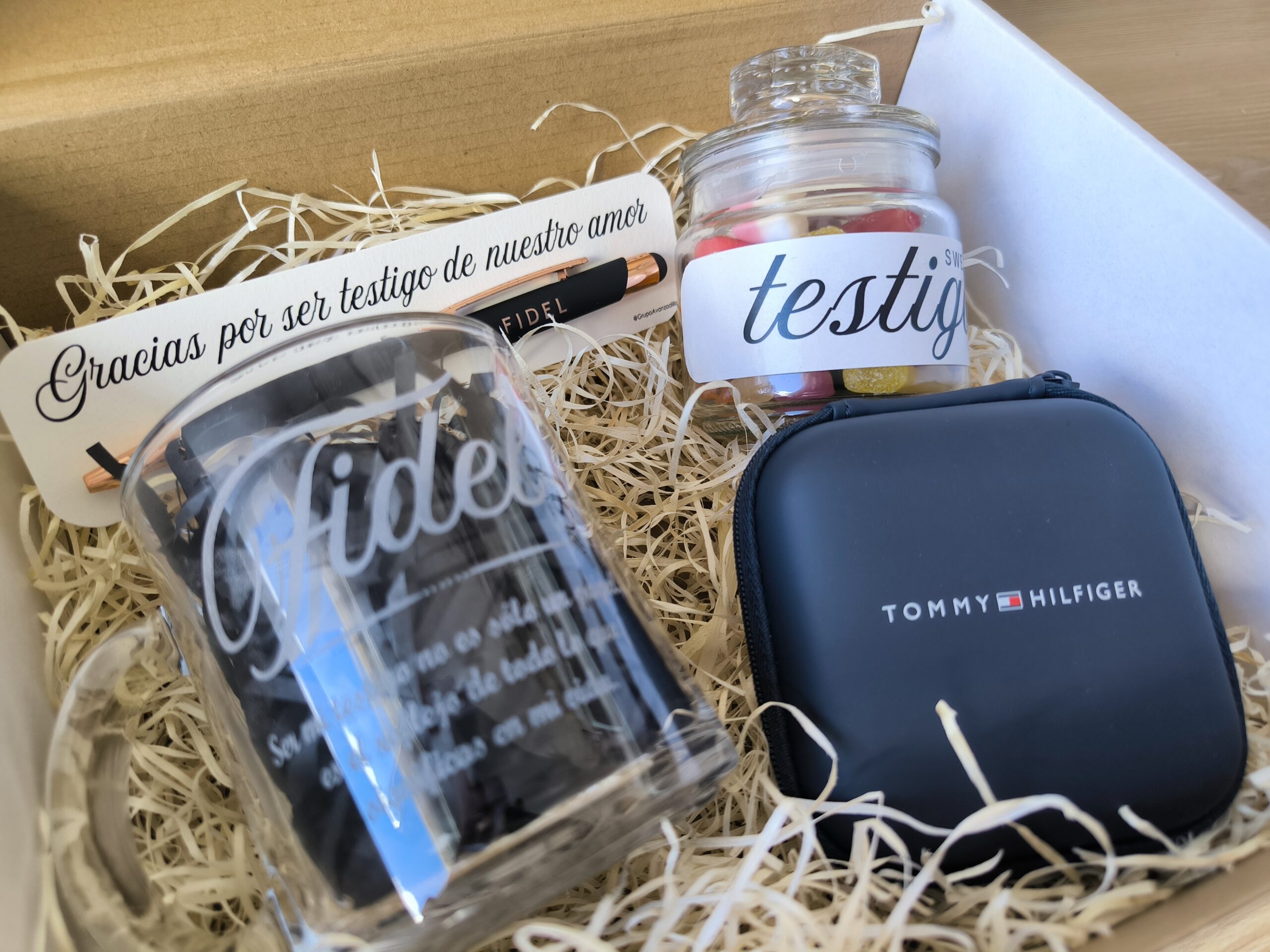 Sorprende a quienes siempre han estado a tu lado con estos regalos para testigos personalizados, un cofre lleno de detalles e ilusión. Encontrarás un vaso personalizado, perfecto para brindar en ese momento tan especial, un bolígrafo que acompañará en ese día, un tarro de chuches personalizado para endulzar en el momento y un elegante monedero. Este conjunto está pensado para regalos para testigos que marcan la diferencia.